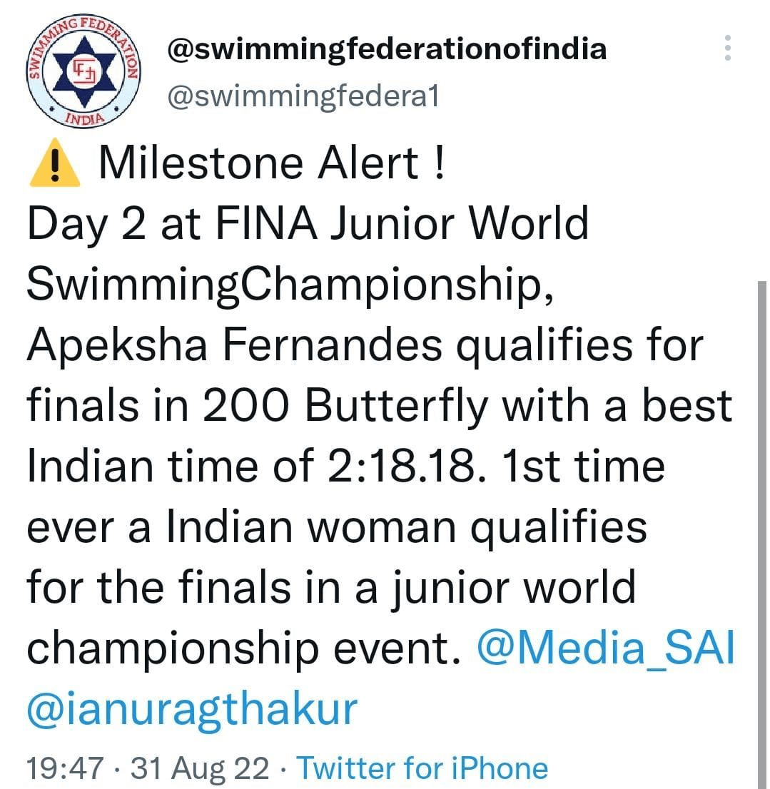 - Qualified for finals in 200m butterfly at the 8th FINA World Swimming Junior Championships, 2022 in Peru. This is the first time an Indian woman qualified for finals in a junior world championship event.