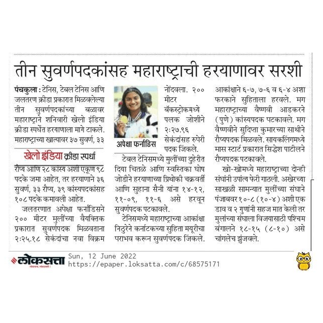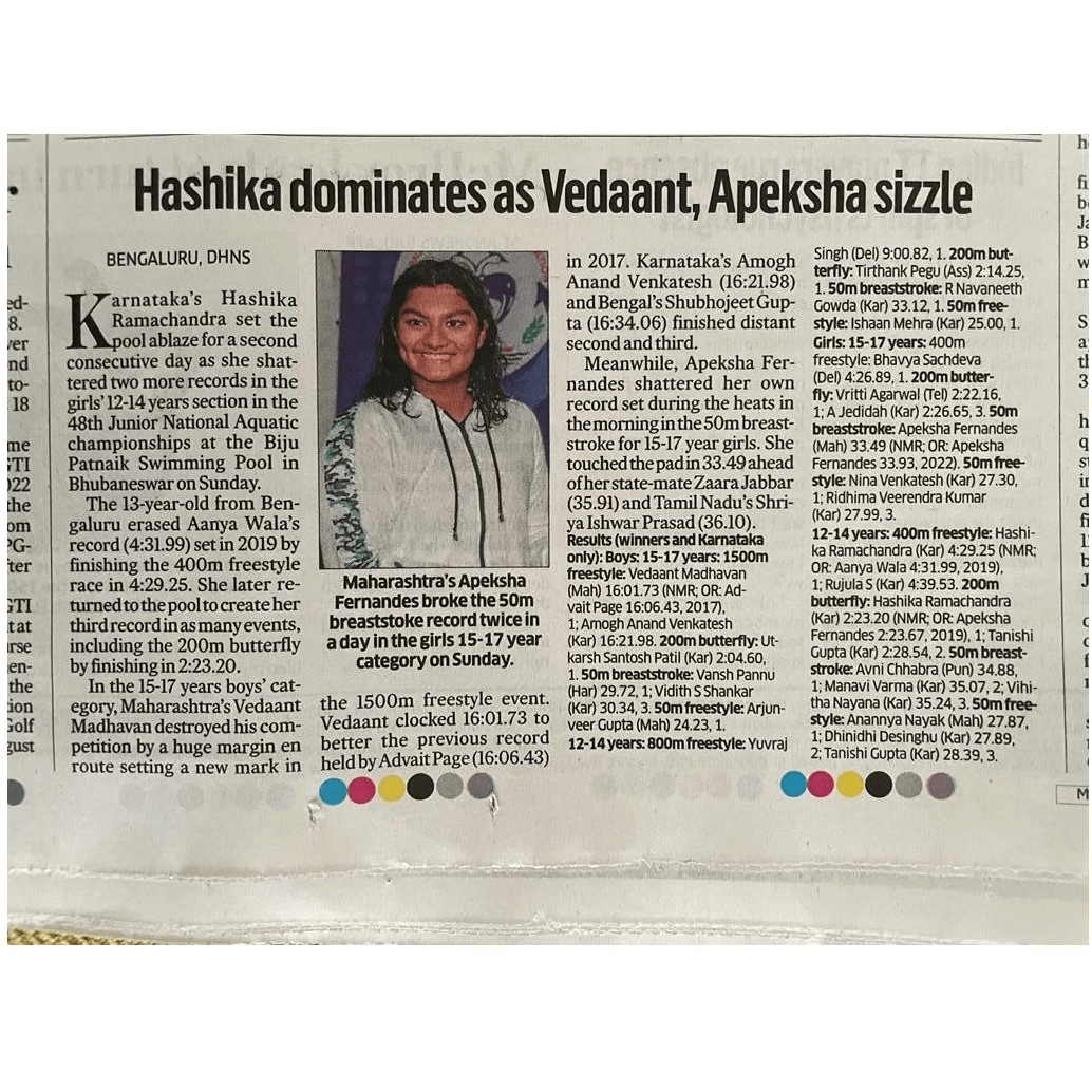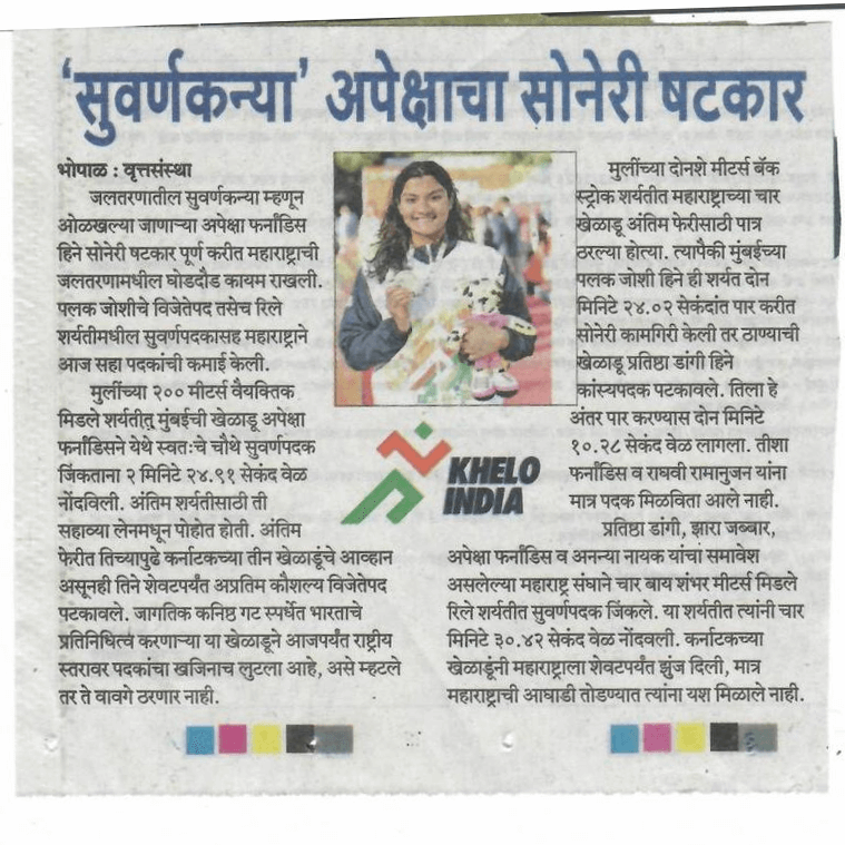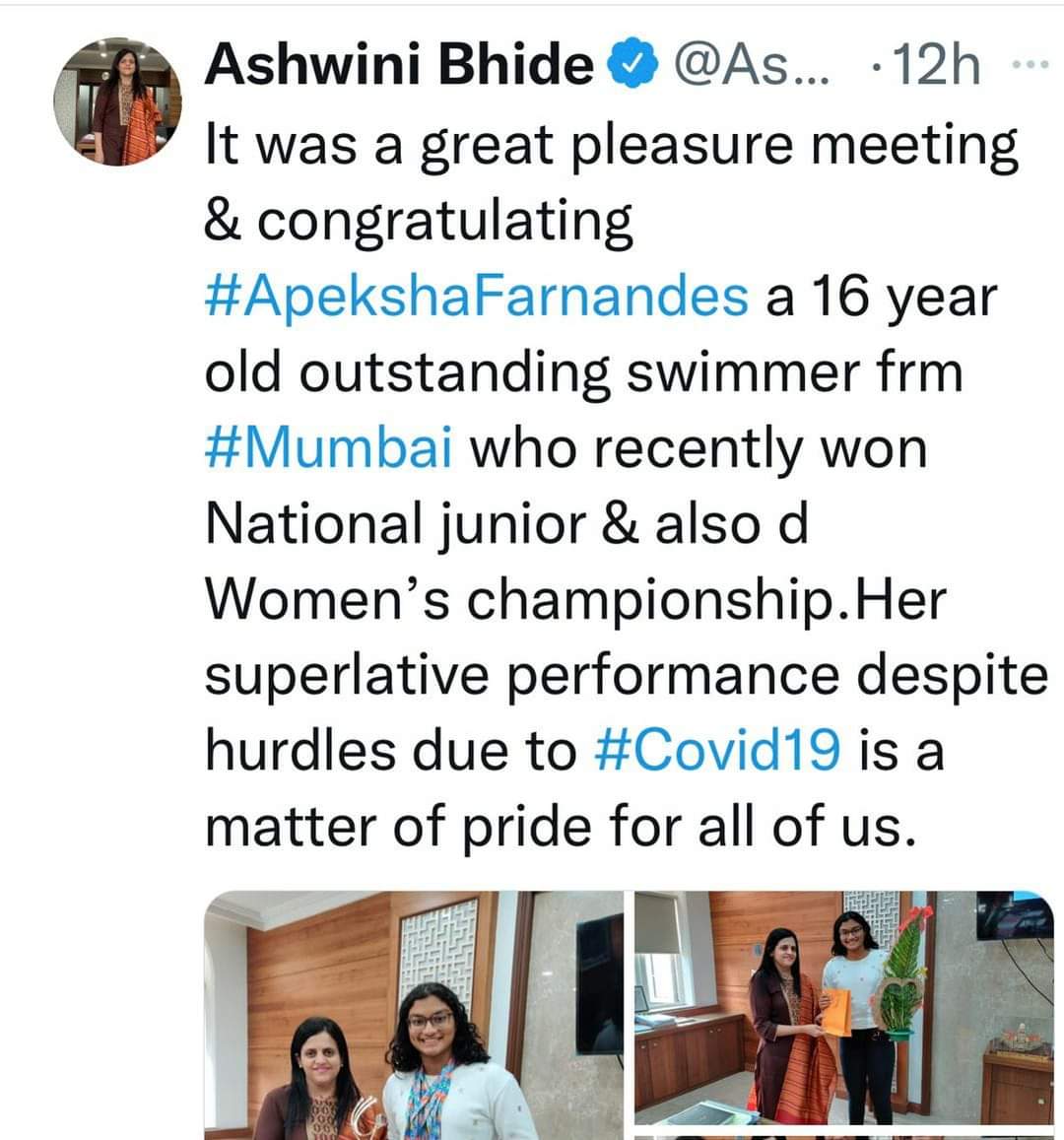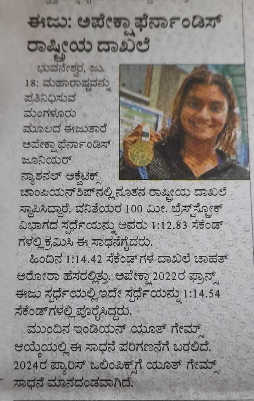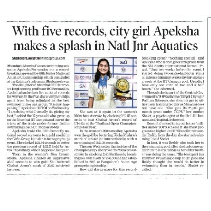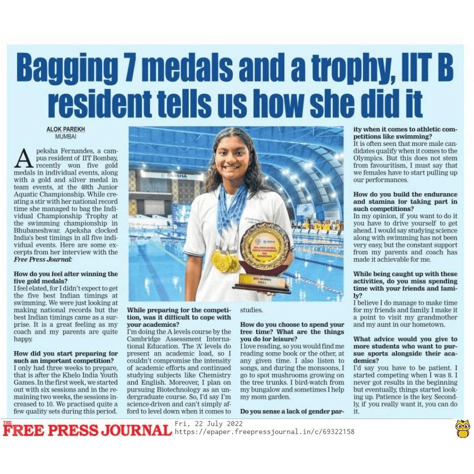 Apeksha Fernandes, an international swimmer, has set multiple national records and received several awards for her performance. Some of her accomplishments include winning the Best Swimmer Trophy at the Junior National Aquatic Championships for three consecutive years (2019, 2021, and 22). She won the Best swimmer (Women) at the senior National Aquatic Championship in 2022. She has also received a Certificate of Appreciation from IIT Bombay for her performance at various national and international swimming competitions.
