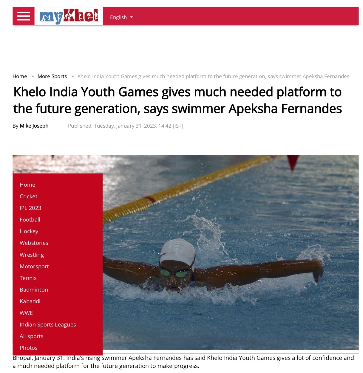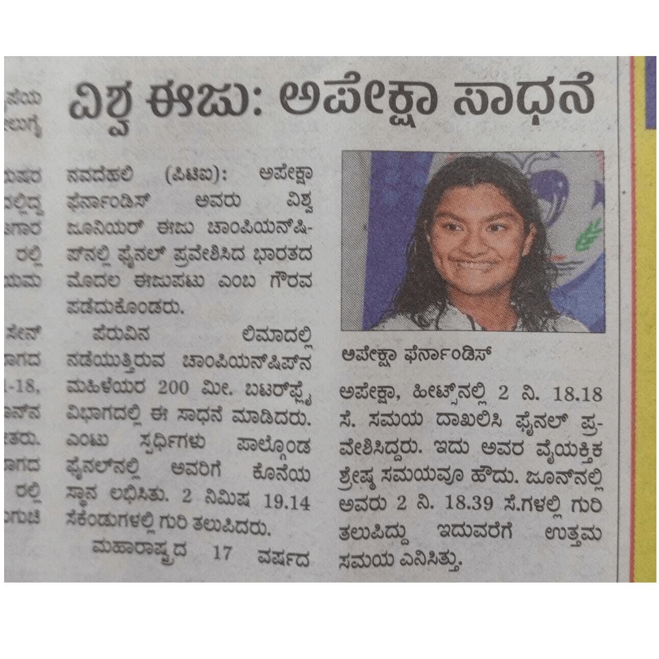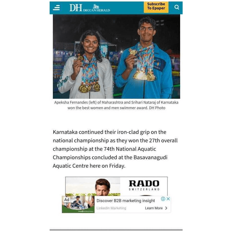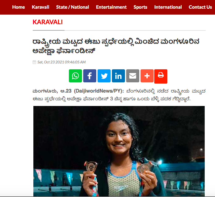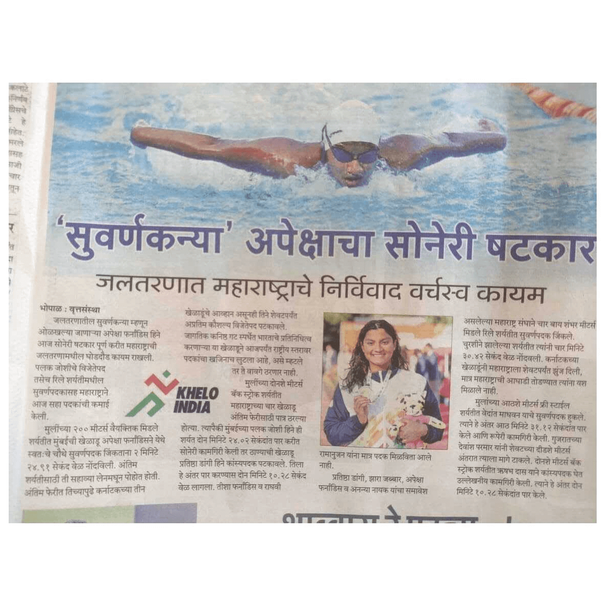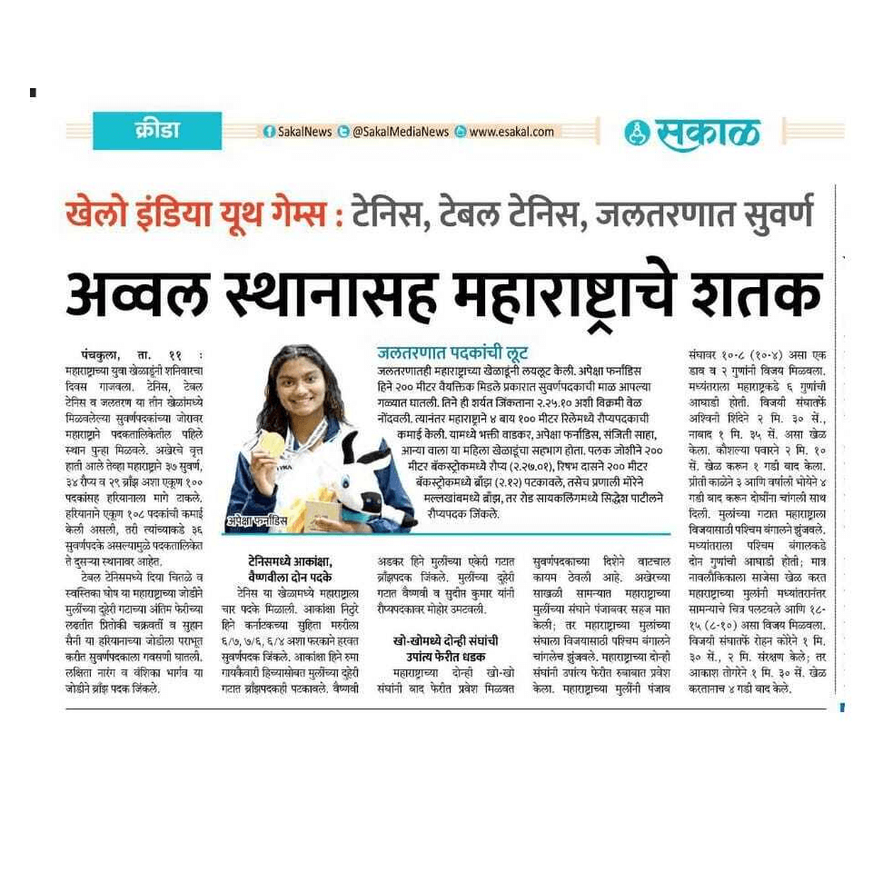 Apeksha Fernandes, an international swimmer, has set multiple national records and received several awards for her performance. Some of her accomplishments include winning the Best Swimmer Trophy at the Junior National Aquatic Championships for three consecutive years (2019, 2021, and 22). She won the Best swimmer (Women) at the senior National Aquatic Championship in 2022. She has also received a Certificate of Appreciation from IIT Bombay for her performance at various national and international swimming competitions.