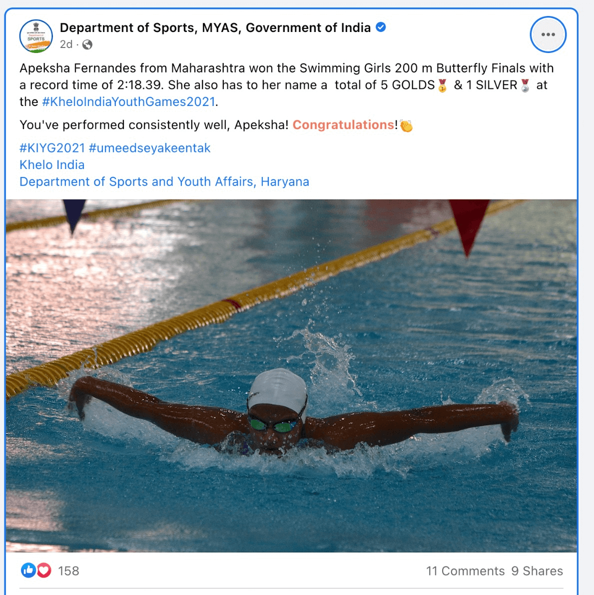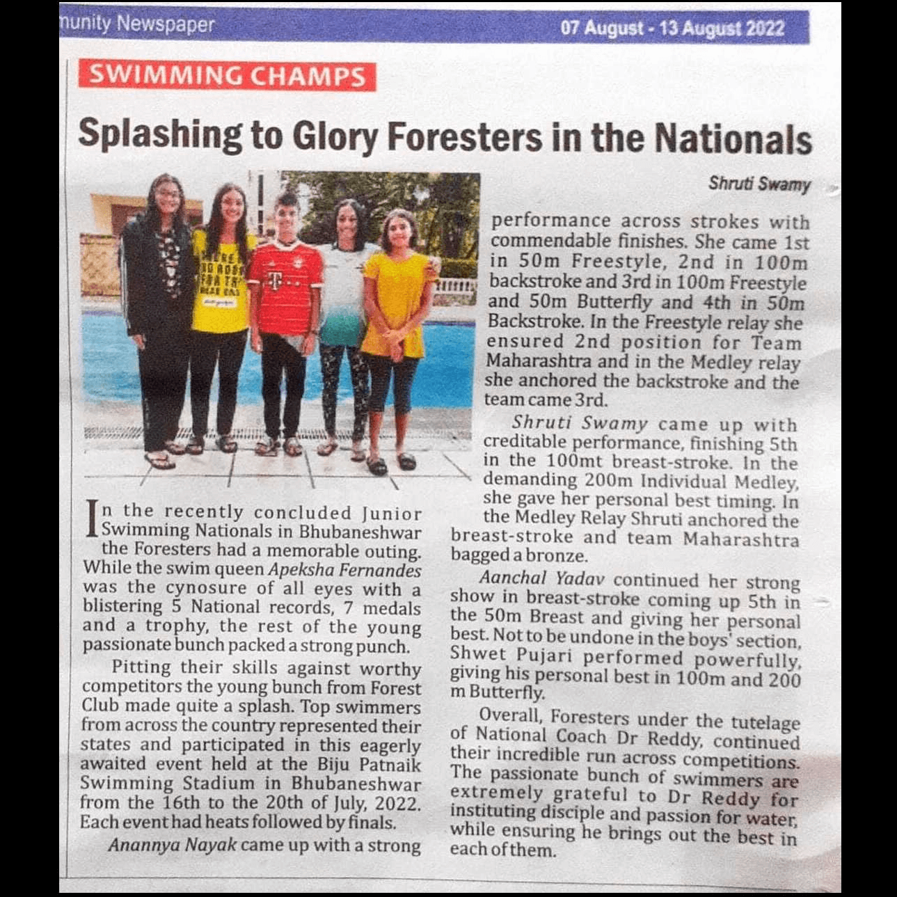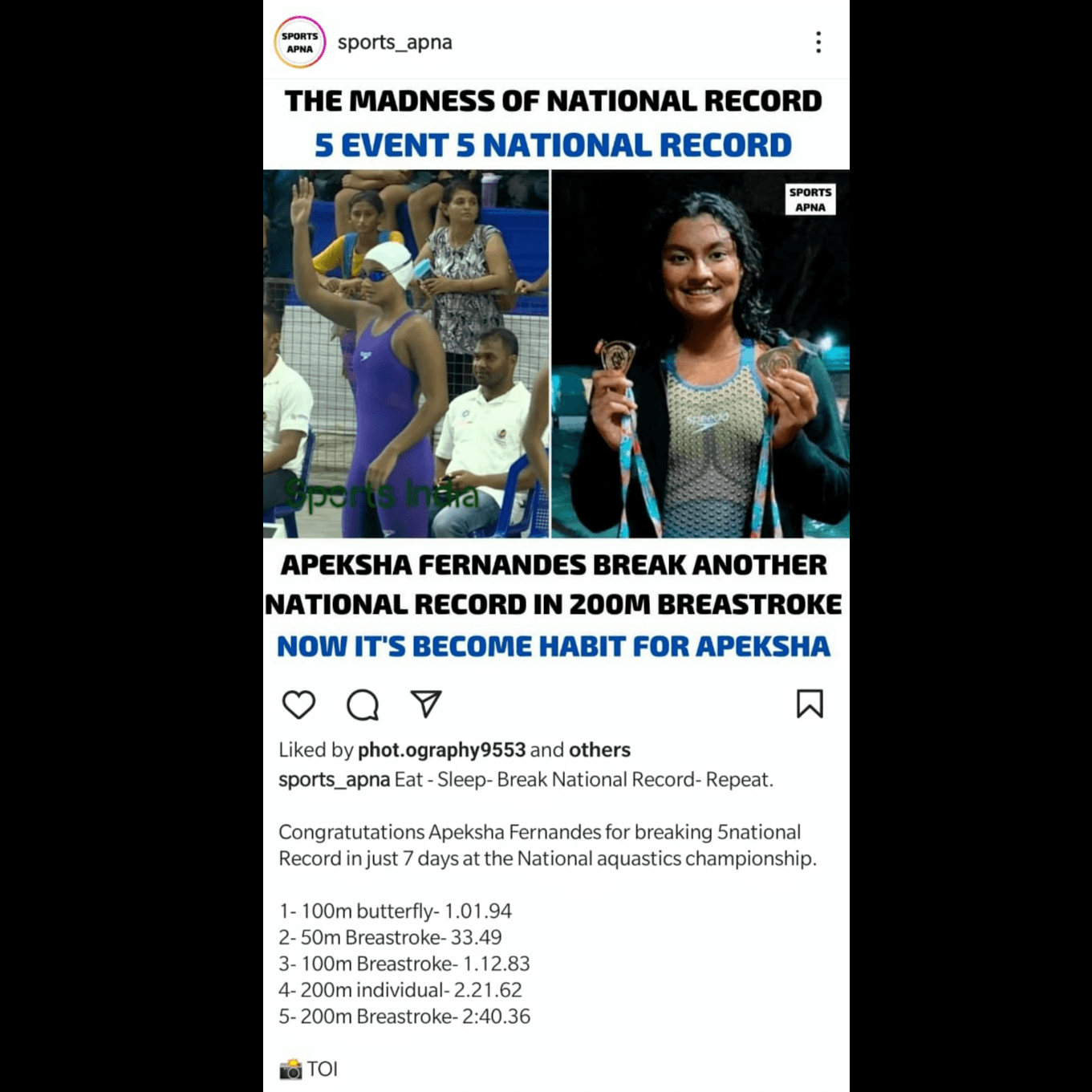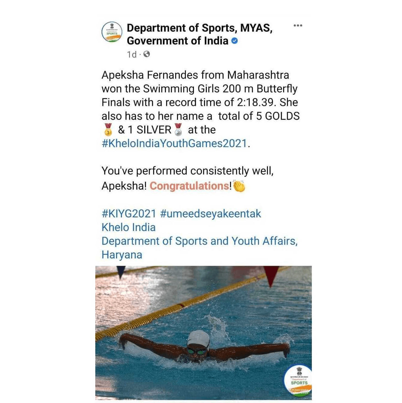 Apeksha Fernandes, an international swimmer, has set multiple national records and received several awards for her performance. Some of her accomplishments include winning the Best Swimmer Trophy at the Junior National Aquatic Championships for three consecutive years (2019, 2021, and 22). She won the Best swimmer (Women) at the senior National Aquatic Championship in 2022. She has also received a Certificate of Appreciation from IIT Bombay for her performance at various national and international swimming competitions.