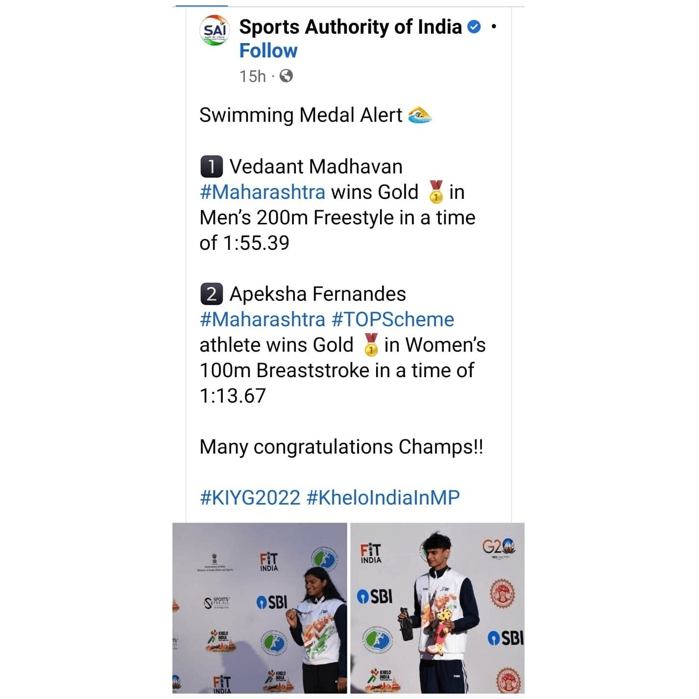 On victory stand at 73rd Senior National Aquatic Games, Bhopal