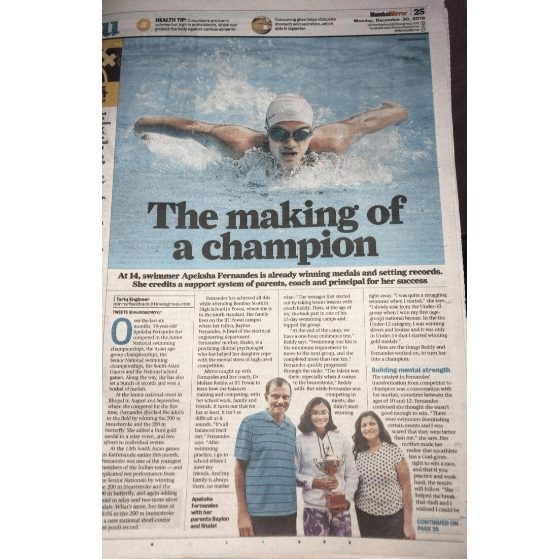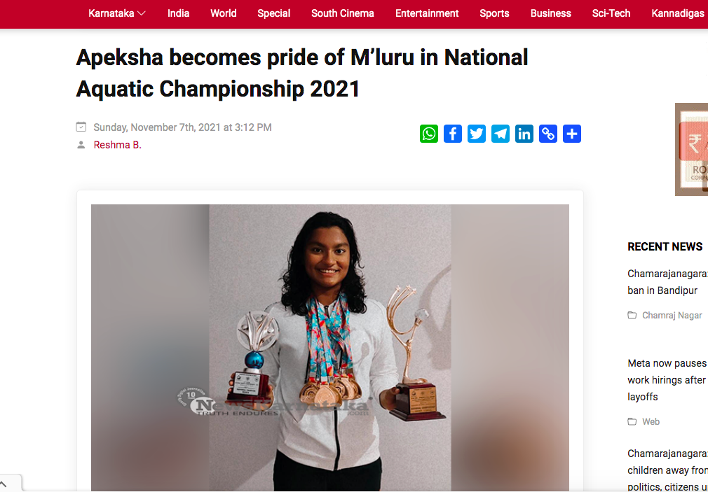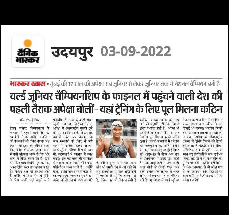 Whilst busy representing her country and state in different swim meets, Apeksha has not lost sight of her academics. She has consistently shown outstanding academic capabilities in school.