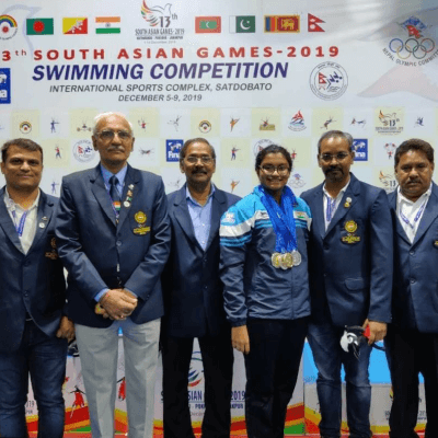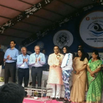 On victory stand at 73rd Senior National Aquatic Games, Bhopal
