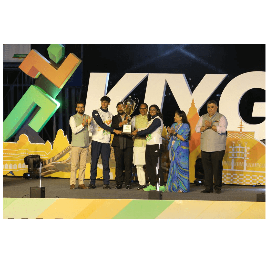 Receiving Championship Trophy at KIYG ( Bhopal) With Hon. Chief minister of MP and Hon. Union Minister of Youth Affairs