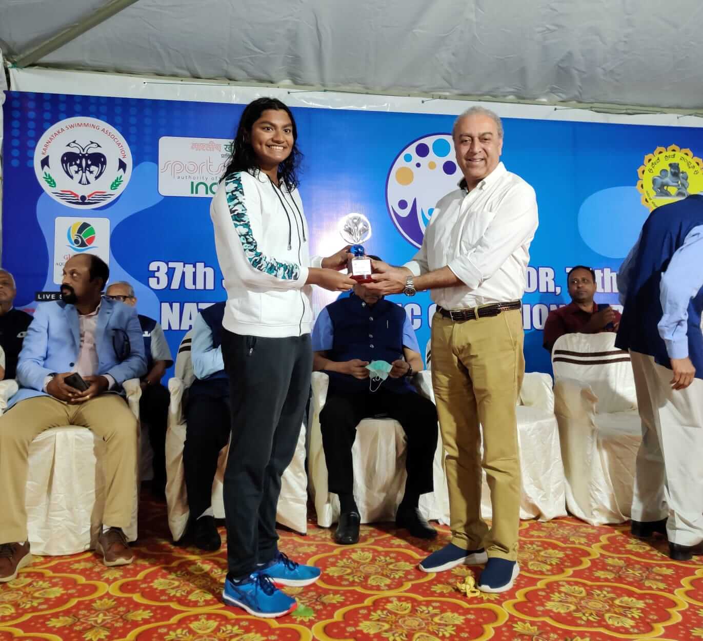 Receiving Best Swimmer Trophy (Women) at Senior Nationals Aqu. Champs, 2021